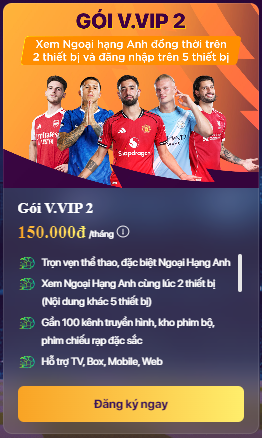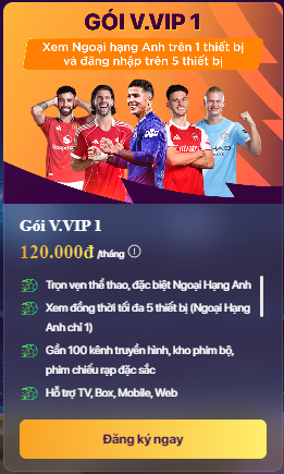 Gói V.VIP là gói xem dịch vụ truyền hình FPT Play được chuyển đổi từ gói IZI dành cho khách hàng đang sử dụng dịch vụ truyền hình FPT. Người dùng ngoài xem nội dung chương trinh cơ bản còn đón xem đủ 380 trận bóng đỉnh cao ngoại hạng anh.